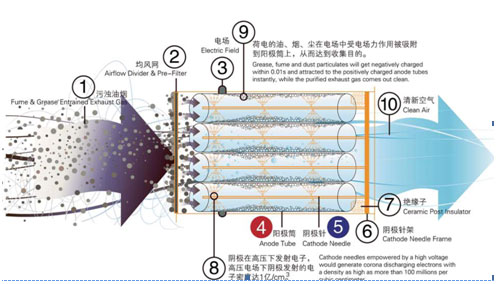 電場的設(shè)計使廢氣粒子的運(yùn)動速度較低,一般在零點(diǎn)幾秒內(nèi)便能使廢氣粒子荷上足夠的電荷,帶電粒子在電場中會受到電場力(庫侖力)的作用,其結(jié)果是油煙粒子被吸附到陽極上。因此凈化率非常高,而且特別適用于捕捉粒徑較小和重量較輕的廢氣粒子。